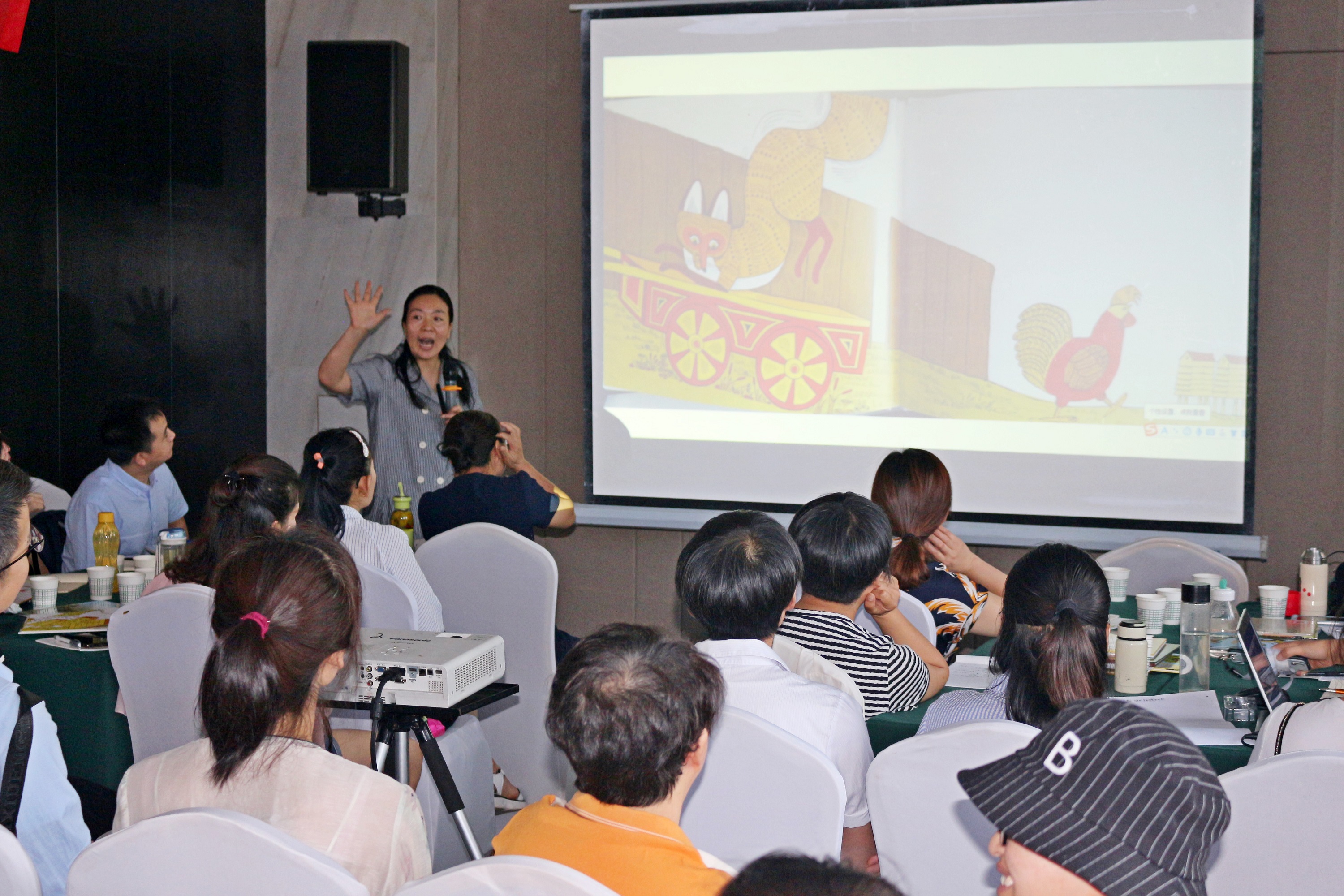▲赵军芳老师以绘本《母鸡罗丝去散步》为例做示范