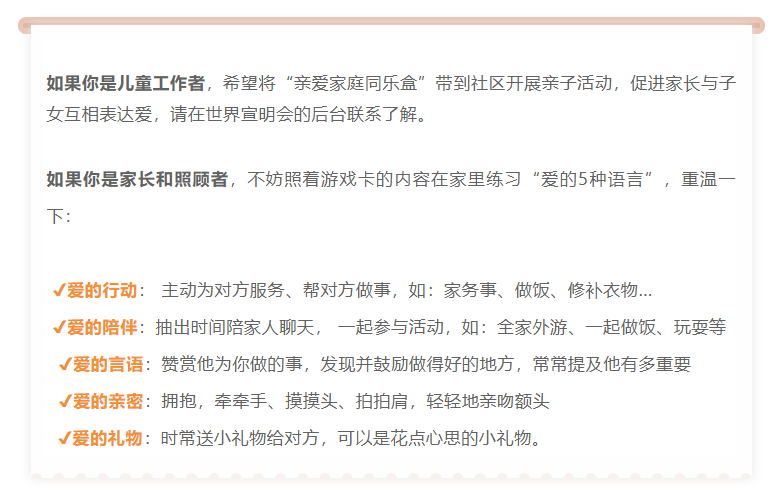 你知道吗?为了给予儿童及家庭更好地支持,助力儿童健康有爱的成长环境,世界宣明会设计一套“同乐盒游戏日活动”指引,并开展了一系列家庭“同乐”的社区活动。同乐盒活动基于#爱的5种语言#设计,让儿童以及父母和照顾者在有趣的亲子游戏里,一起学习向家人表达和接受家人的爱,提升家长/照顾者的正向教养技能,建立亲密、积极的亲子互动关系。