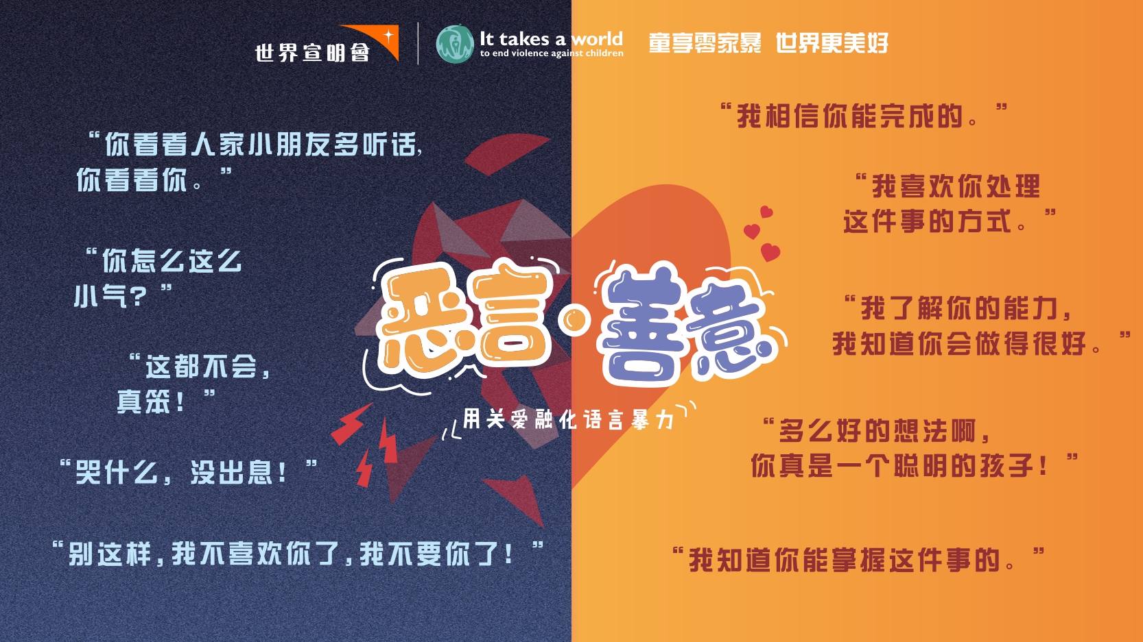 为了让更多人认识到语言暴力的危害,对“恶言”说不,构建“零暴力”的和谐家庭,11月18日至11月22日,我们将继续在线推出“童享零家暴”行动之一——“恶言·善意”活动,携手正能量明星、教育专家共同提倡正向沟通,鼓励营造和谐家庭,避免言语成为加深伤害的利刃,使儿童在丰盛、和平、有爱的环境下健康成长。