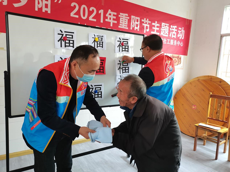 | 杨红平(左一)参加敬老院重阳节活动。(2021年)。