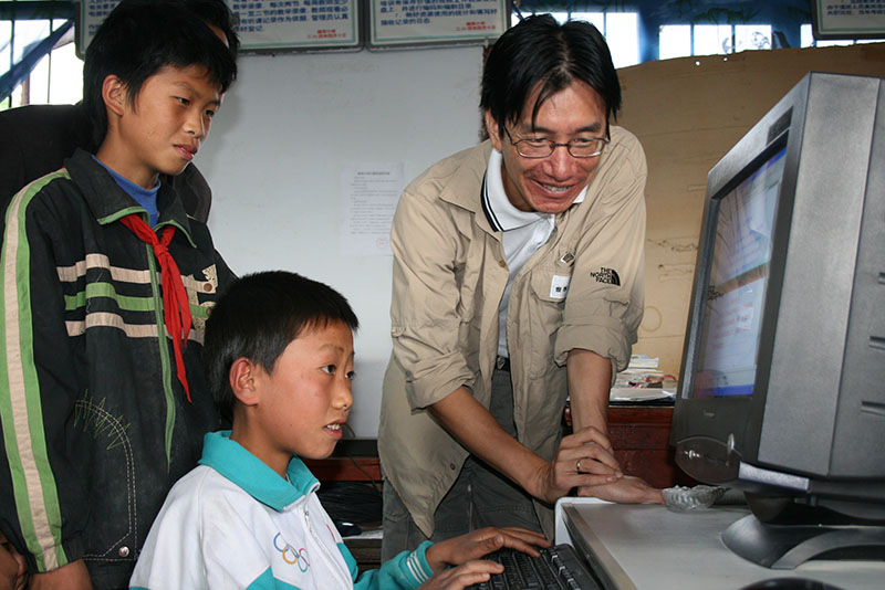 | 2007年6月,丘先生(右一)前往贵州剑河项目点,了解儿童对世界宣明会捐赠的电脑的使用情况。