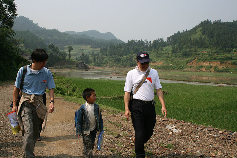 | 2007年6月,丘先生(左一)陪同当时的世界宣明会-中国总干事前往贵州勘察水灾。图为勘灾途中遇到放学归来的儿童,并给他送上儿童包。