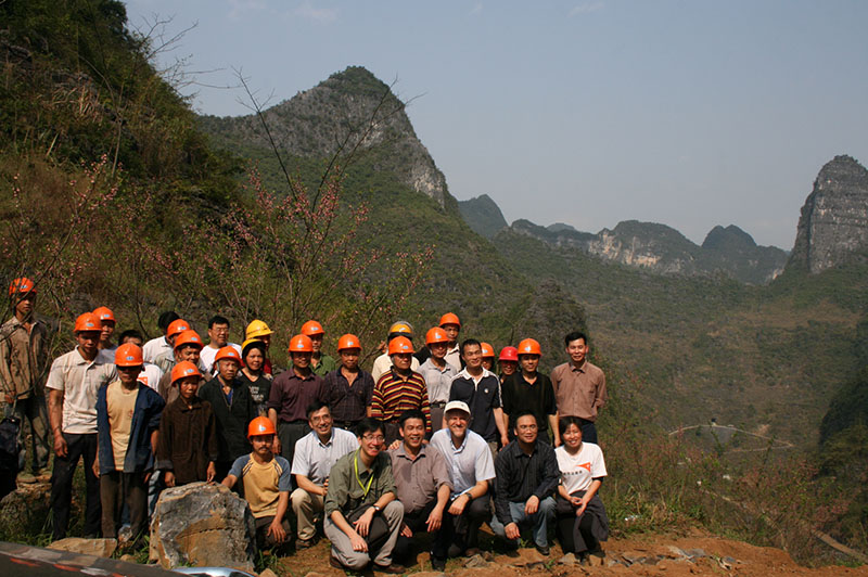 | 2009年2月,丘先生(前排左一)一行探访都安项目。图为他们前往保安乡看望挖掘隧道的村民。