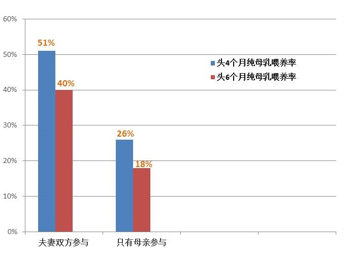 中国的一项研究比较夫妻参与母乳喂养促进项目与只有母亲参与项目对纯母乳喂养率的影响,结果是前者的头4个月和头6个月纯母乳喂养率均高于后者,如下图所示。