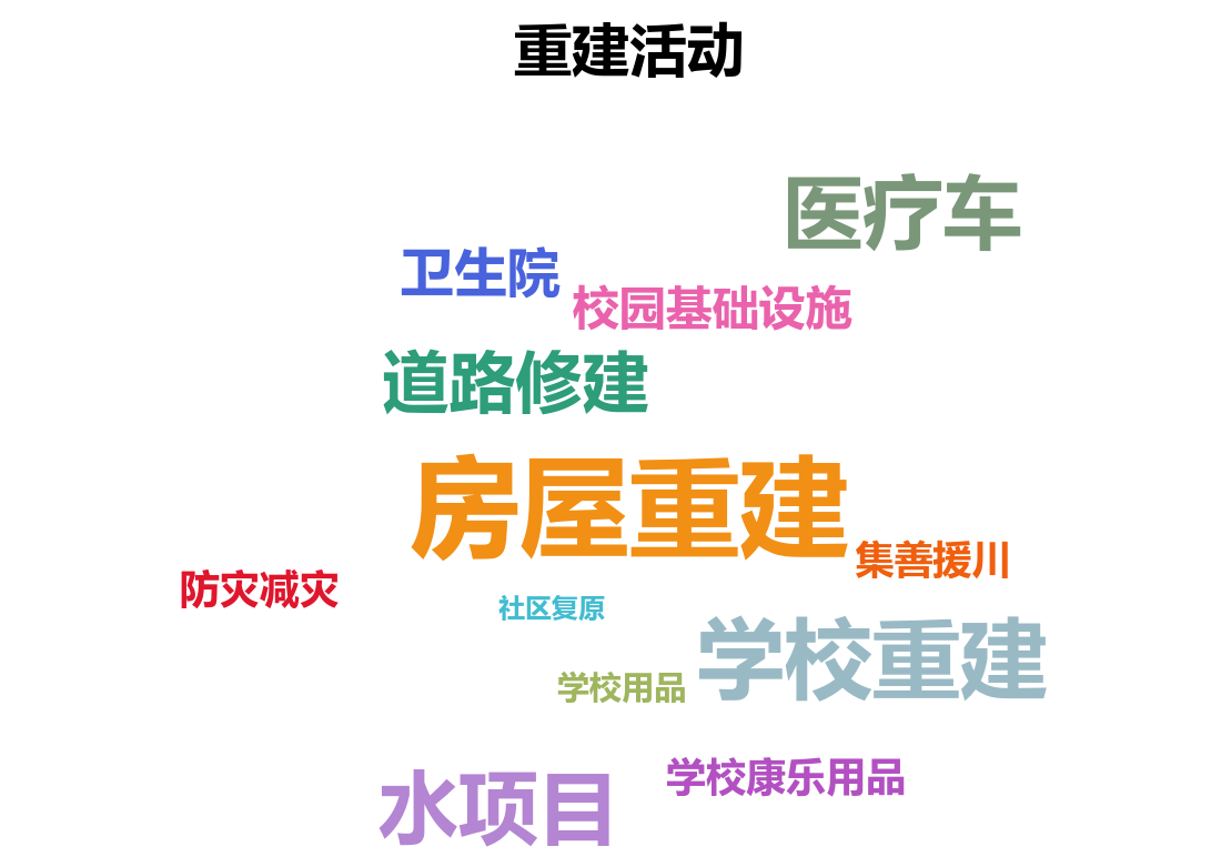 重建工作在震后约一个月在灾区陆续开展,包括学校重建、民房重建、医疗卫生、社区小型基建和生计发展,以及各类儿童活动和防灾减灾活动等;帮助灾民恢复灾前生活水平,以及提升他们的防灾和自我保护意识,增强抗逆能力,以应对今后可能发生的灾害。