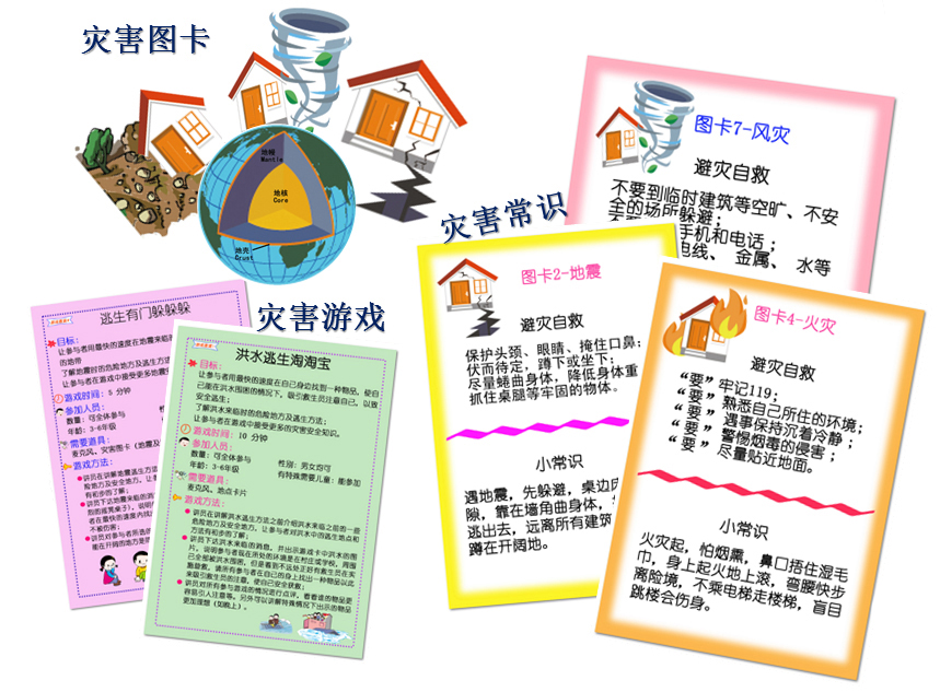 通过多次与学校和老师配合活动的经验以及相关人员的意见,我们设计制作了一套《老师工具包》,共有36张卡片,其中包括9张灾害图卡,8张常识卡,10张地点卡和6张防灾小游戏教案。这套工具包采用游戏的方式提高学生学习防灾减灾的兴趣,也方便老师携带及学习和带领防灾减灾游戏活动。