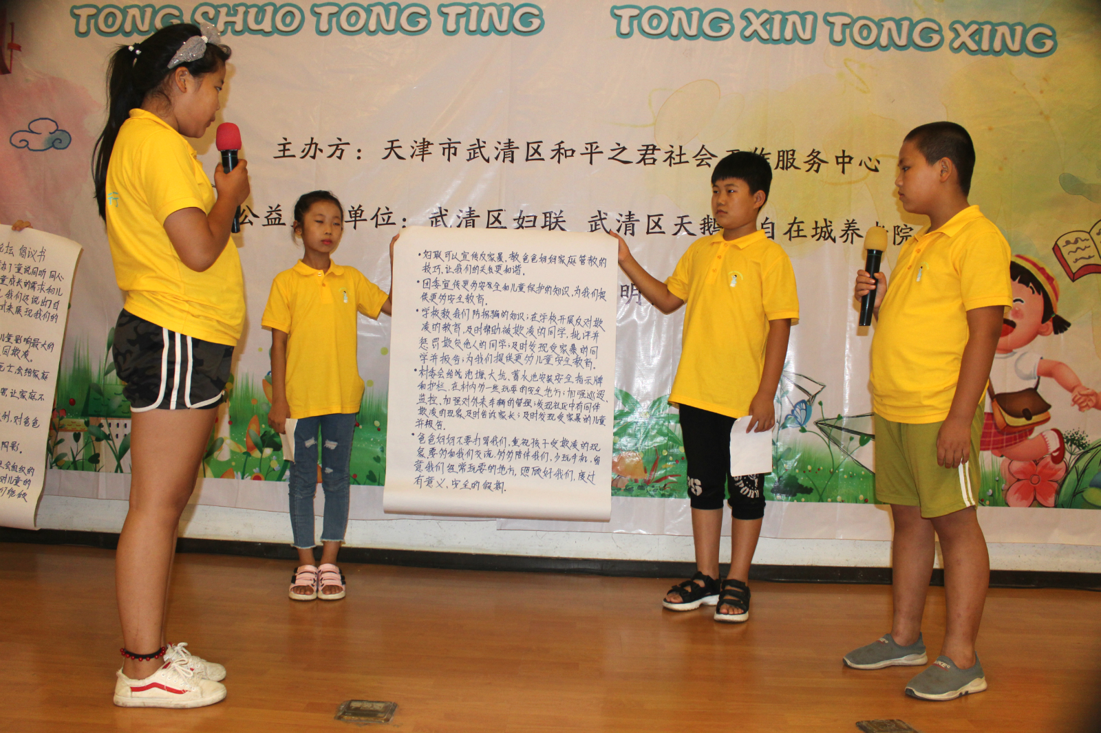 本地公益组织在回答儿童的问题,近年来,武清区本地公益组织自发组织了家长委员会,通过集体亲子活动的形式向更多家长传输正面管教积极关爱的家庭教育方法。