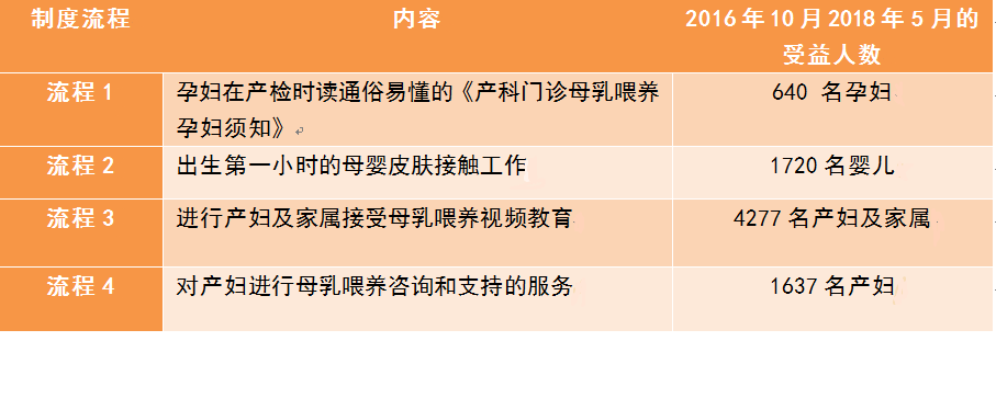 自2013 年开始,宣明会与武定县妇幼保健院合作“强化爱婴医院项目”,从软件和硬件上加强能力,将爱婴医院的标准本地化,建立了四个制度流程,使母乳喂养支持工作与常规工作得以整合。总体受益情况如下: