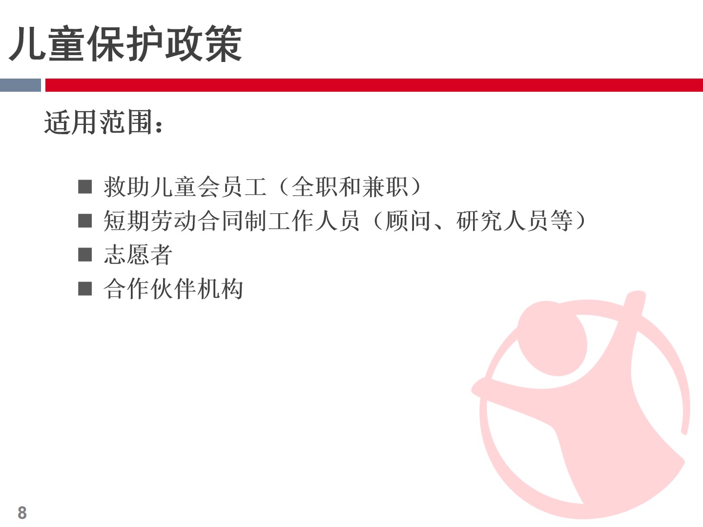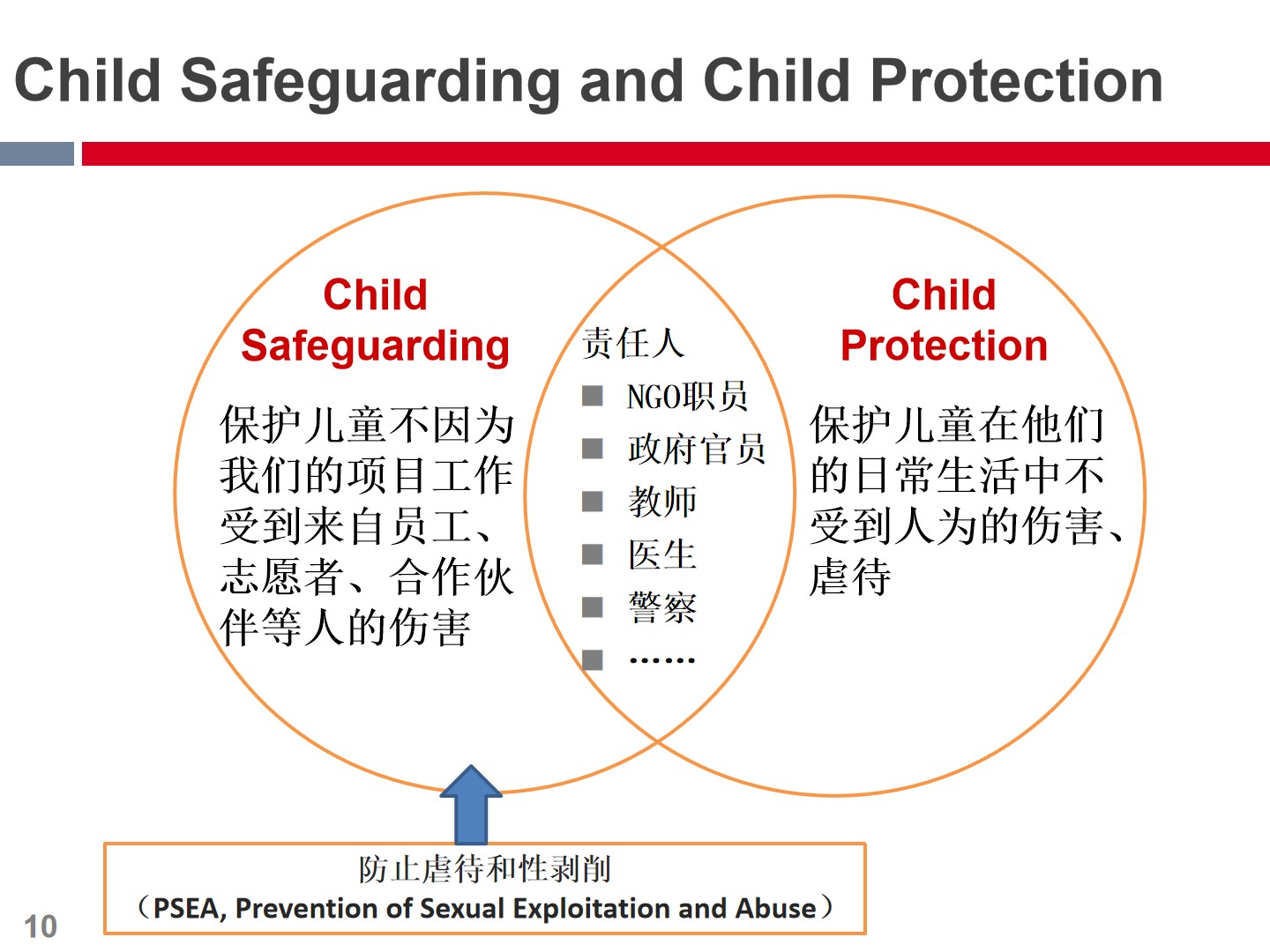 儿童保护(Child safeguarding)政策是“保护儿童不因为我们的项目工作受到来自员工、志愿者、合作伙伴等人的伤害”。这有别于儿童保护项目(Child Protection),即“保护儿童在他们日常生活中不受到人为的伤害和虐待”。同时也例举儿童保护政策有其明确的适用对象,确保组织内部权职分明。