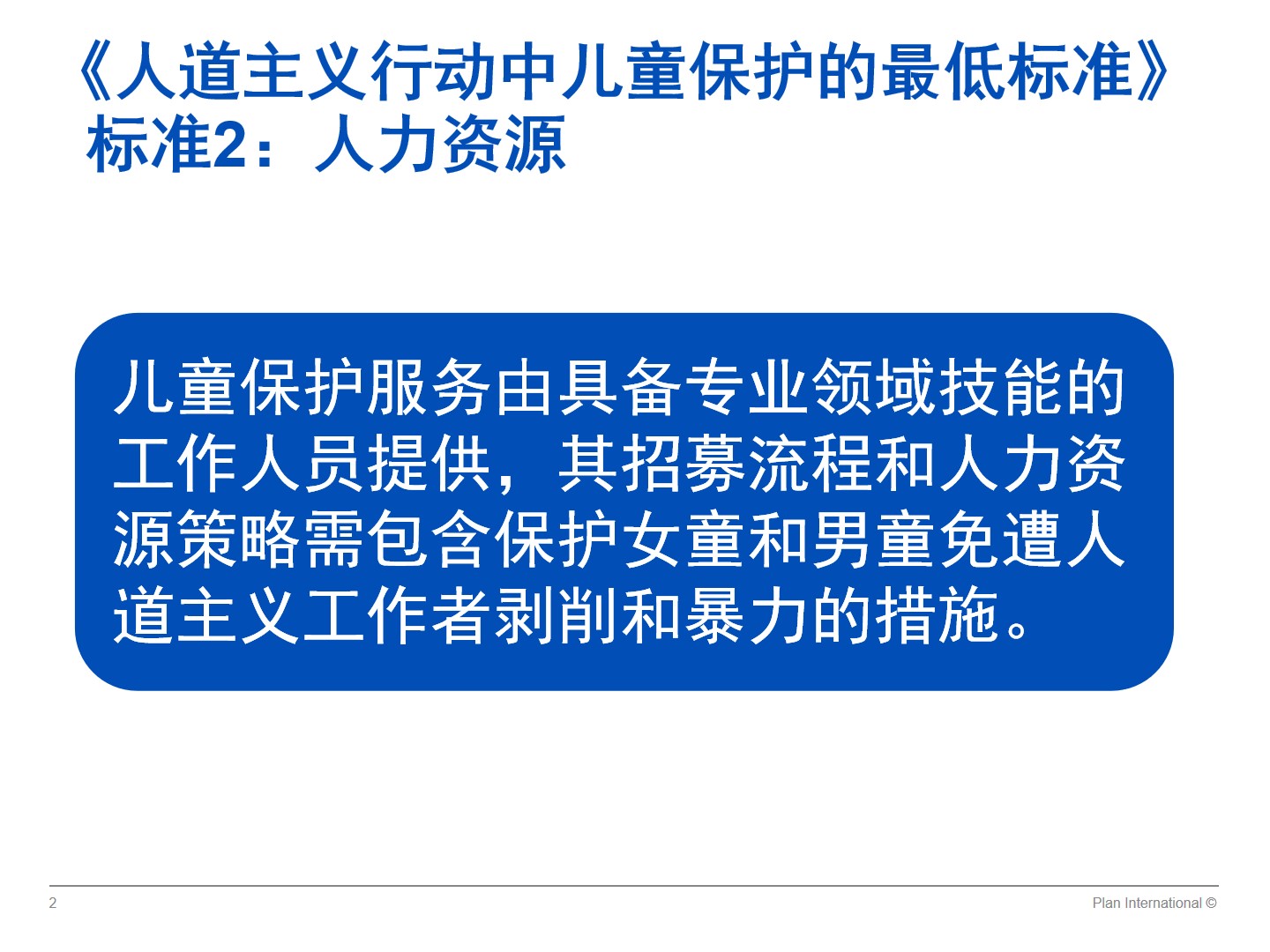 这部分介绍了工作人员、志愿者招募及管理中的儿童保护要素,并强调“招募流程和人力资源策略需包含保护女童和男童免遭工作者的剥削和暴力的措施”的儿童保护最低国际标准。并建议在人力资源和招聘中加入以下元素: