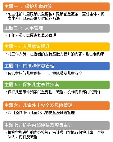 会议上,世界宣明会、救助儿童会、国际计划、儿童乐益会分别就7大主题(见下图)分享了国际机构的经验。