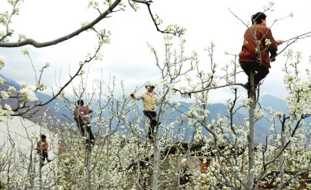 他们化身小蜜蜂,爬上树梢给梨花授粉;