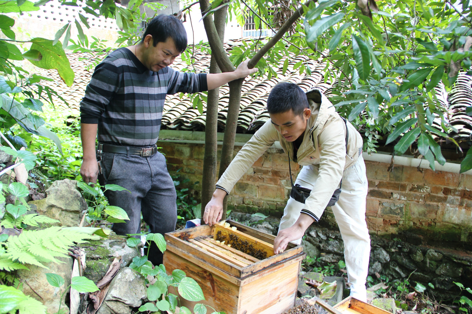 ▲吉全(左)在观察技术员的操作,这是他第一次养蜜蜂,也是第一次开蜂箱,他非常地开心。
