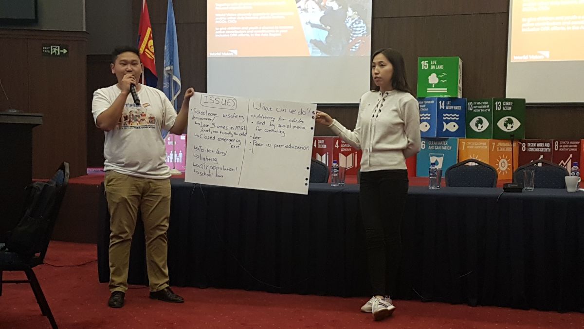 Khanbogd Tsengel,17岁,作为世界宣明会的儿童代表在会议上分享道:“儿童也需要具备在灾害中相互帮助的能力。为此,我们的青少年救援俱乐部给儿童教育和分享如何预防灾害、降低灾害风险的知识和技能,例如,在地震、火灾或水灾的时候如何应对及帮助他人。