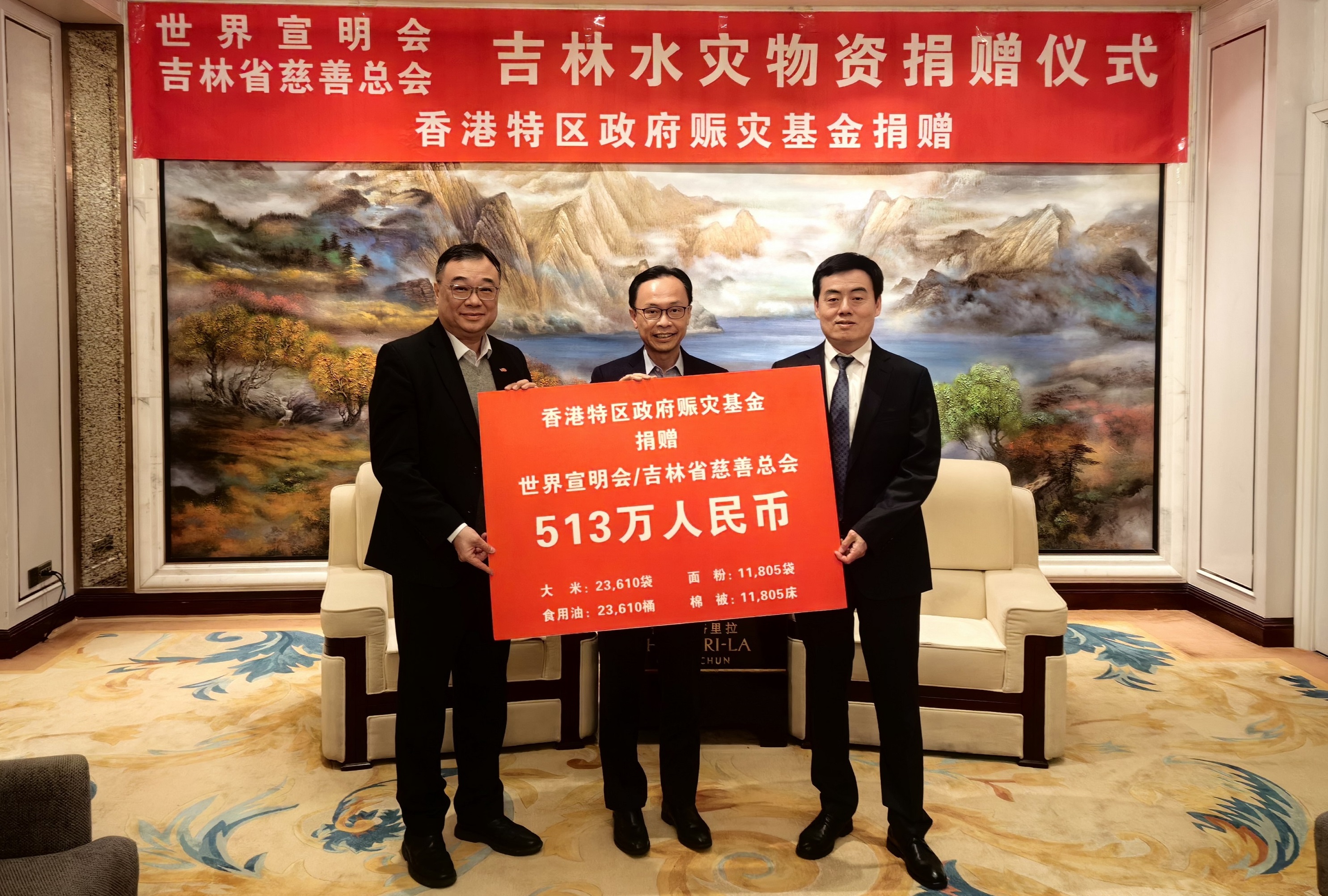 为此,世界宣明会申请香港特区政府赈灾基金,向吉林省舒兰市和榆树市(受灾严重地区)七个乡镇共计11,805户受灾群众,捐赠米、面、油、棉被等总价值约人民币513万元的爱心物资,缓解他们重建生活的压力。这是香港特区政府继2020年、2022年江西省水灾捐赠数百万爱心物资后,再次通过世界宣明会关注、支持内地的受灾群众。