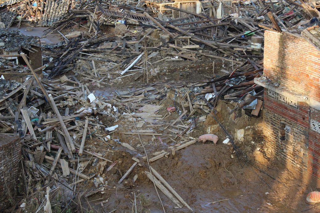 The badly damaged bridges are like the paper toys unconcernedly broken and discarded at the roadside by a naughty child and remind us of the merciless flood. The house ruins are like the scene of a Hollywood disaster movie and remind us of the residents' narrow escape. The once exquisite architecture of the Ming dynasty seems to be cut by an invisible broadsword, which is really a pity. The once elegant 501 enclosed houses of Hakka culture all turned into miserable ruins. It tells us that time is not the cruelest, but disaster is.
