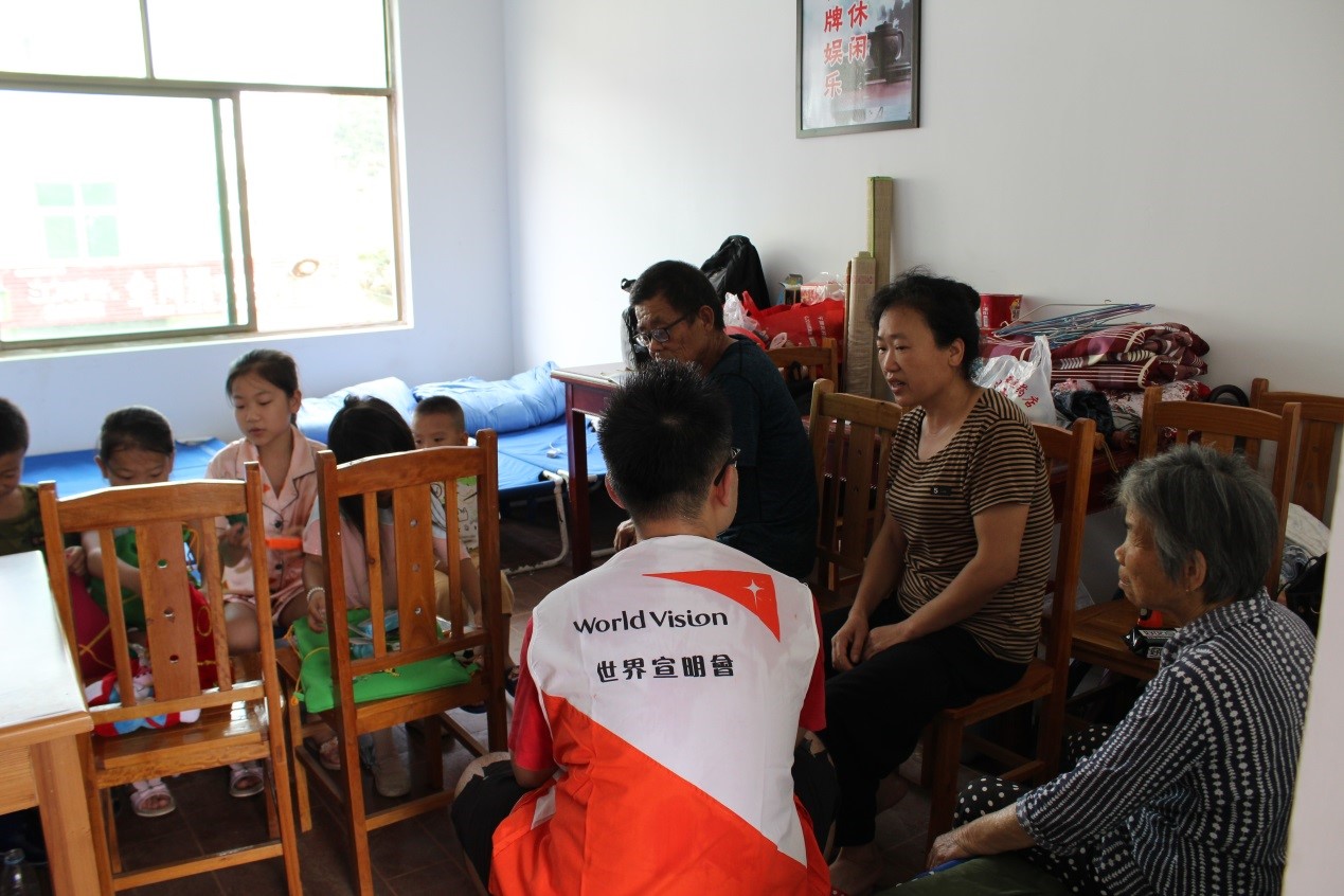▲World Vision staff listening to Xiaoli's mother (second from right) share about how the flood has affected her family.