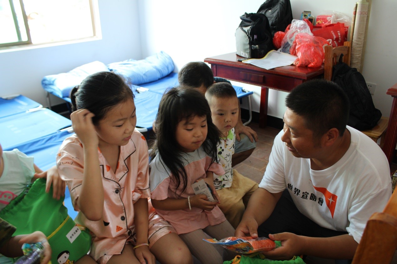 ▲World Vision staff showing the children toys from the child-friendly kits which they can play with while staying at the shelter. Xiaoli (second from left) also received a child-friendly kit.