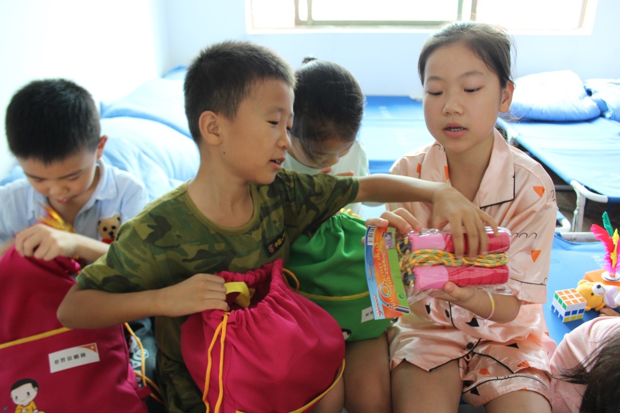 ▲The children were excited to find out what was in the child-friendly kit. Xiaoli (first from right) sharing toys with her brother (second from left).