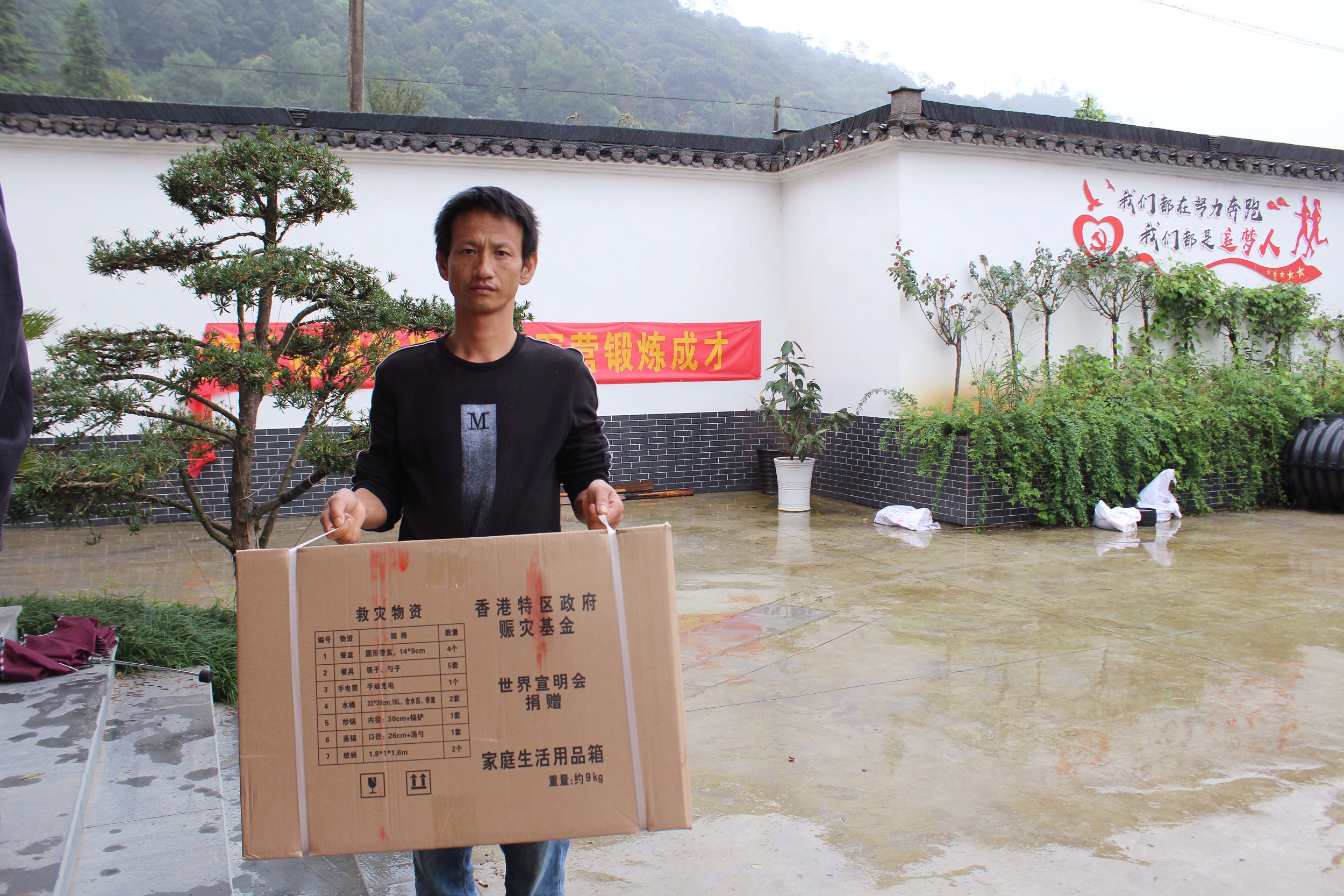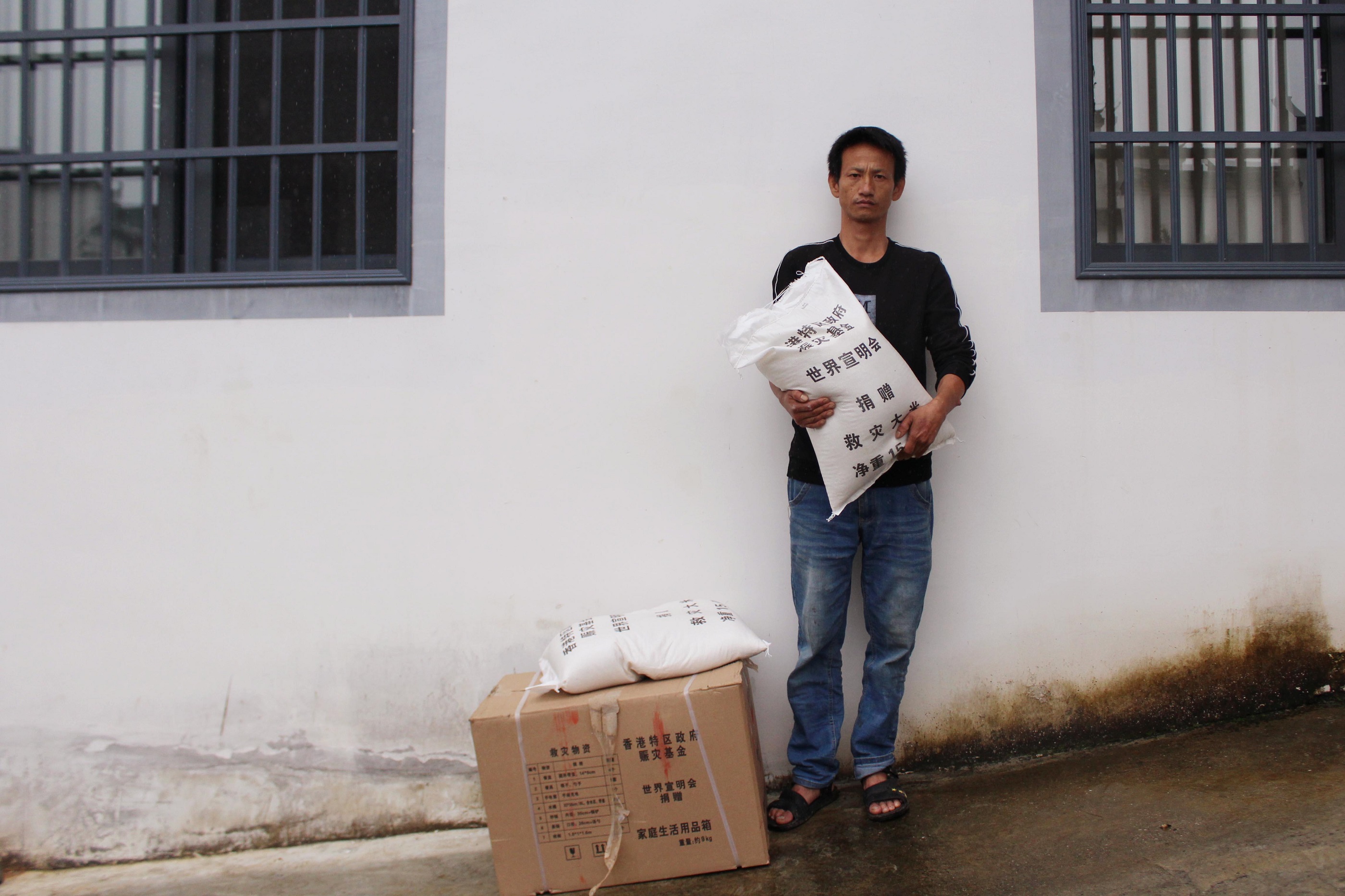 Guiding received two bags of rice weighting 15 kilograms and a family kit. Each family kit consist of a water bucket, flashlight, wok, mosquito net, tableware and other daily necessities. "These things are very useful to me," Guiding said, "I'm pleased and very happy about it."