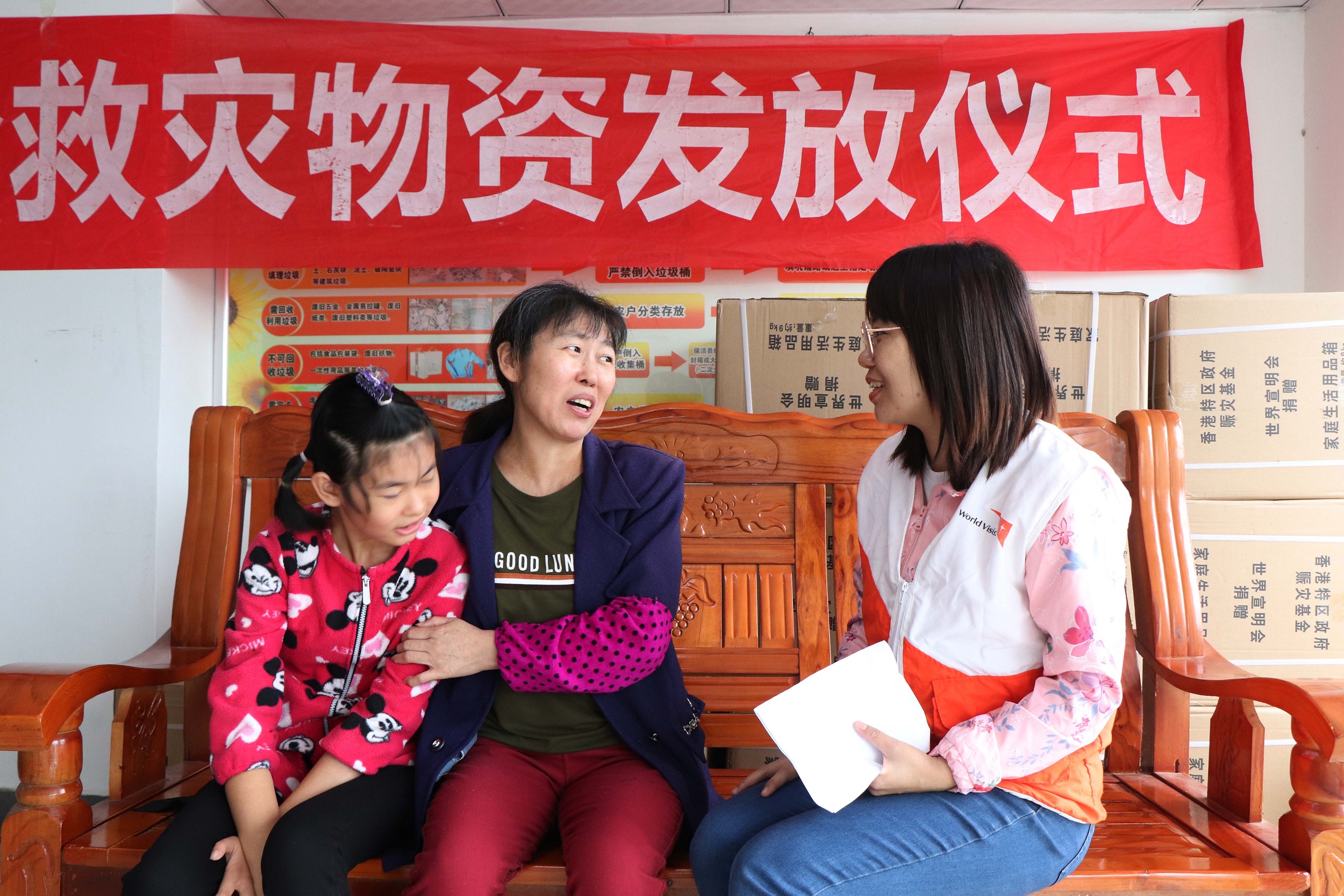 ►Madam Yang (middle) and her daughter (left) talking to a World Vision staff.