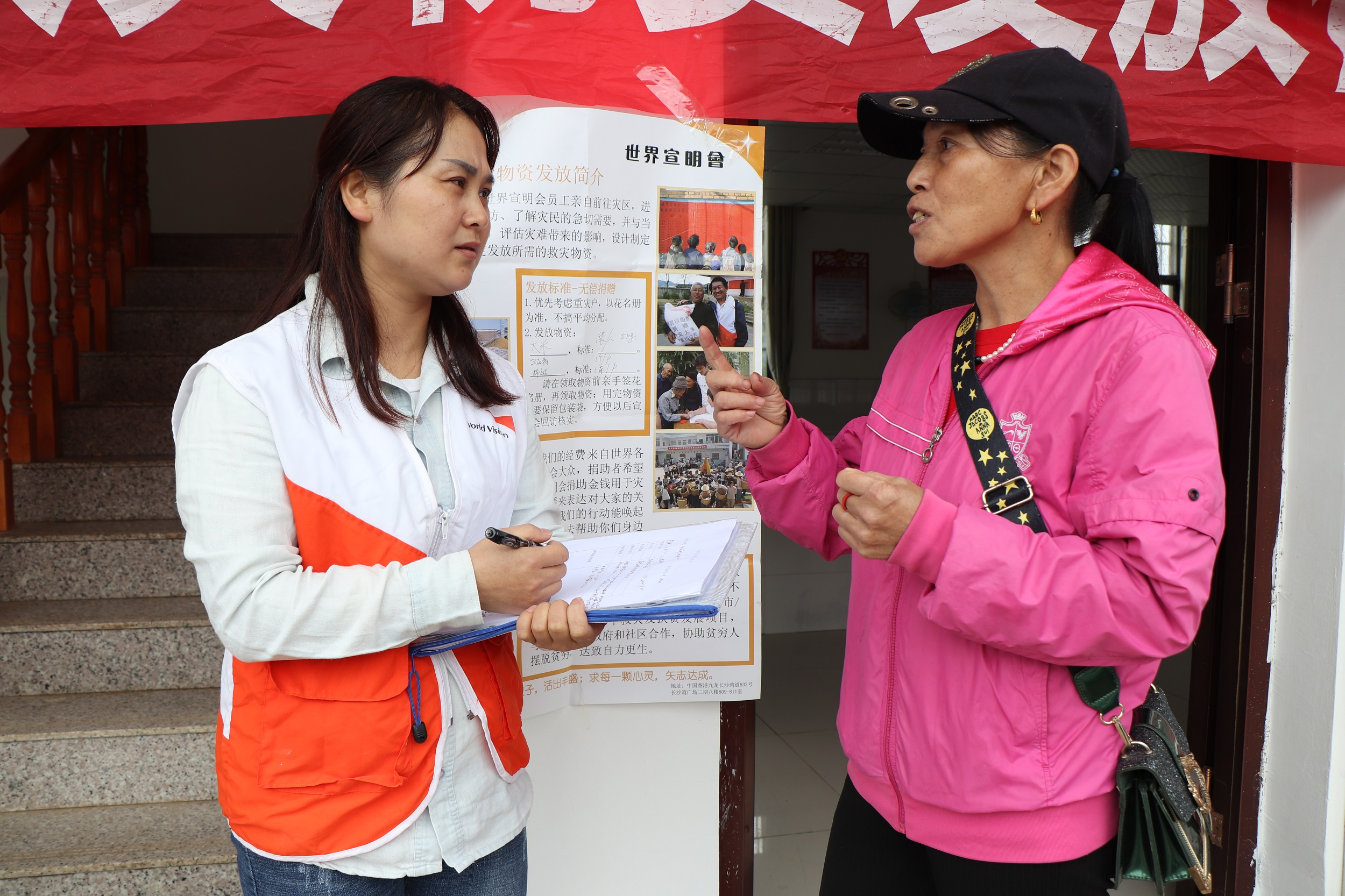 ►A World Vision staff gathering information from Madam He (right) about how her family has been affected by the disaster and also her feedback on the donated items.
