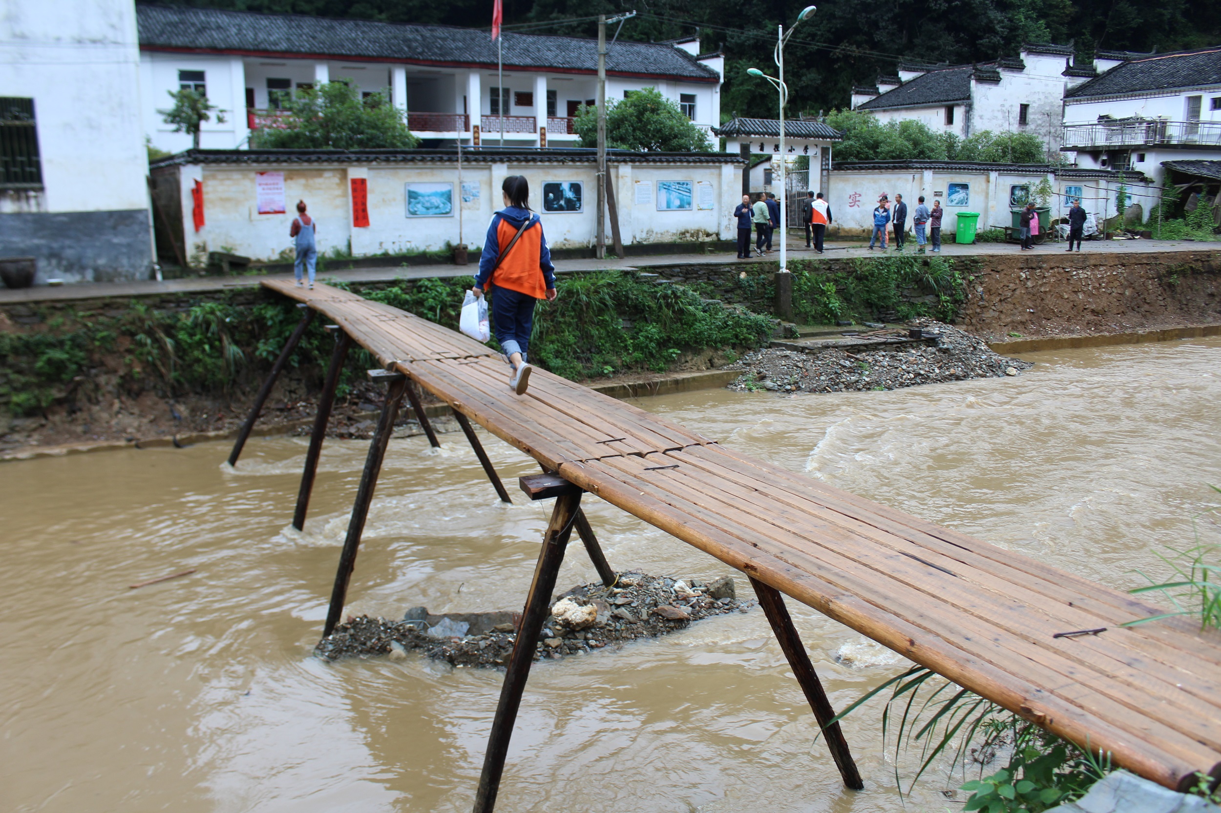 ►A temporary wooden bridge with enough room for only one person to walk on at a time, built at the school entrance.