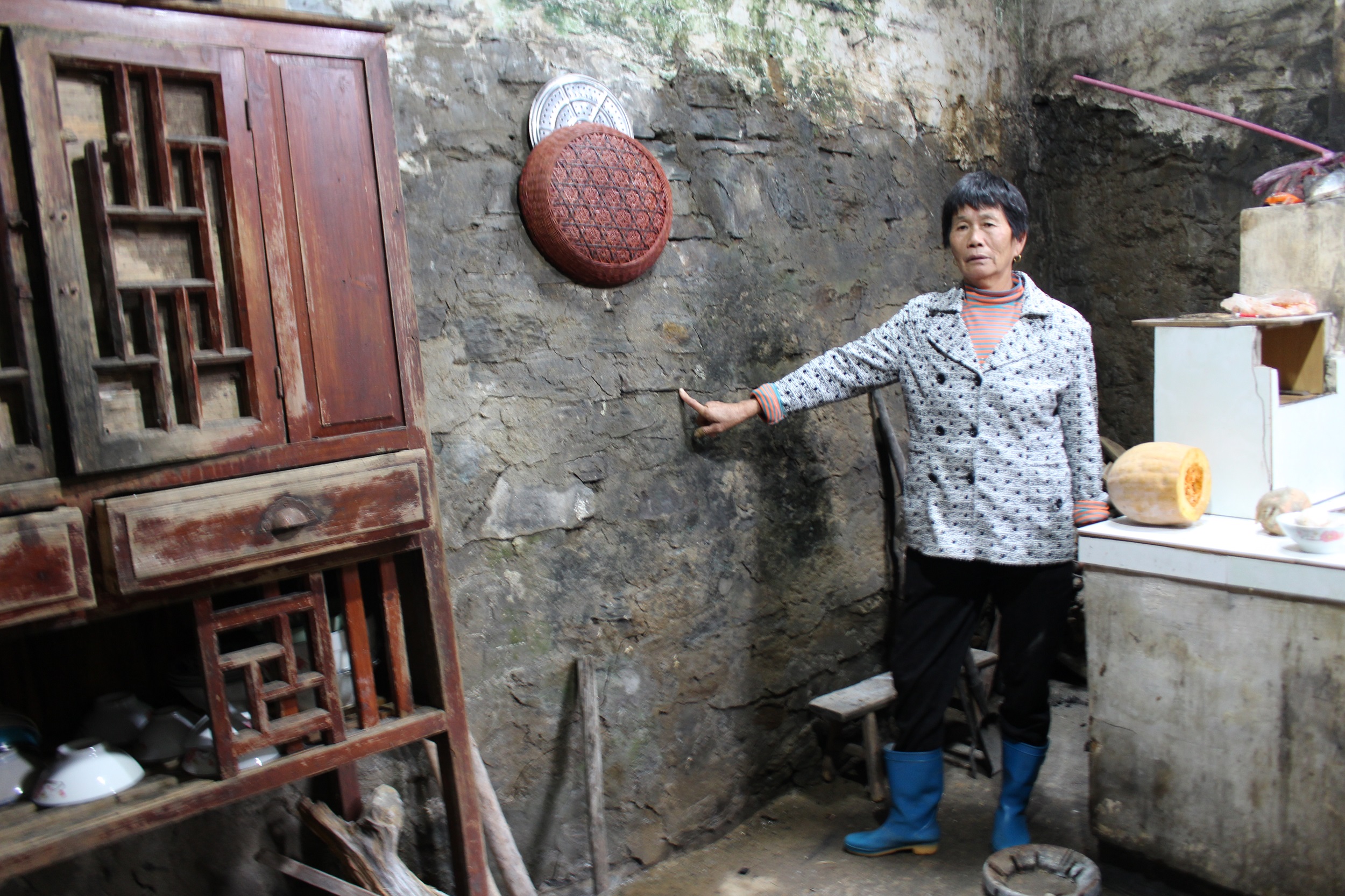 Xiaoshi's house is built against a mountain. Although it is situated on higher ground, it still did not escape the flood. The heavy rainfall also caused a landslide that hit the back of their house, and as a result of this, cracks have appear on a wall in the kitchen. Xiaoshi's grandmother said she does not have the strength to clean the mud and fix the wall, so they will have to wait until her son returns next year to do the necessary.