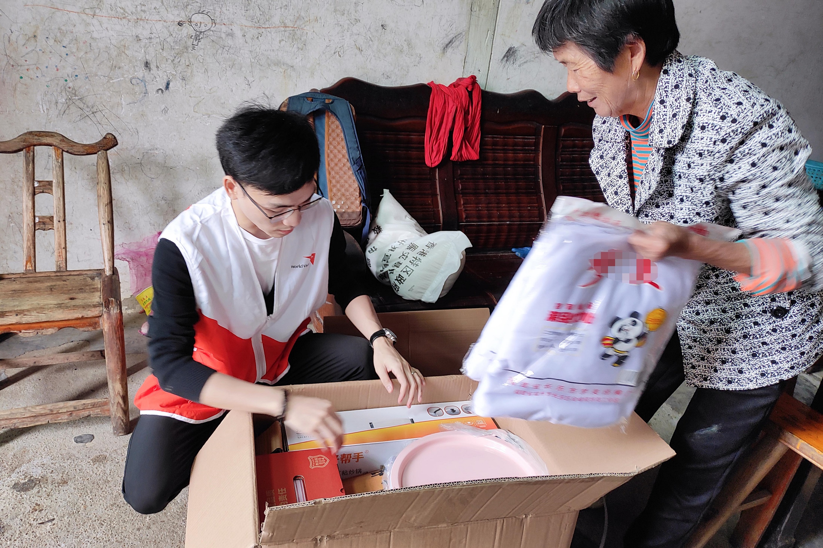 Xiaoshi and her family received 15 kilograms of rice and a family kit which consist of daily necessities such as a water pail, torchlight, cooking pan and tableware. Her grandmother said, "I am so happy because these things are very helpful." Xiaoshi smiles shyly and softly says “thank you” before running into her classroom.