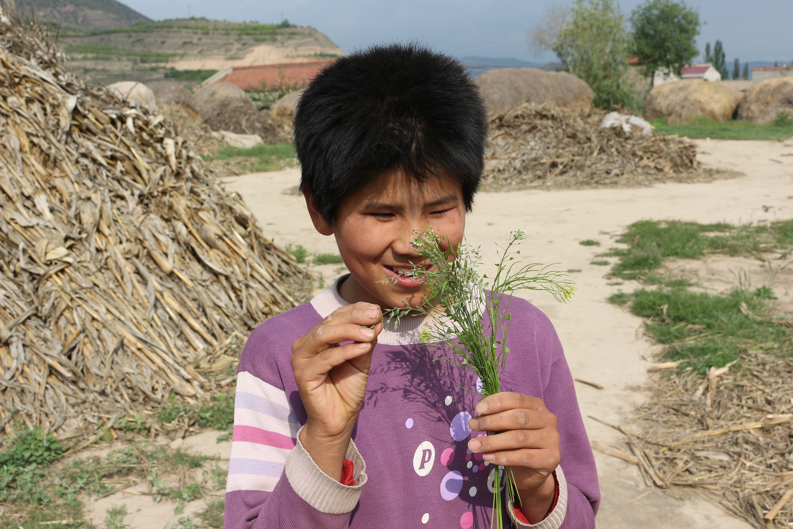 Xiaohai stands quietly under the eaves of her family house and snuggles up to her mother, hand in hand. Wearing a cloth that has already turned white from too much wash and a pair of red shoes, a little face is backed with slightly messy short hairs; Xiaohai’s eyes are tightly closed with a faint smile on her face.