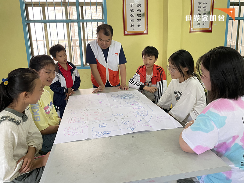 Jay, 3rd from the left, participates in a group discussion with other children and draws their dream village.