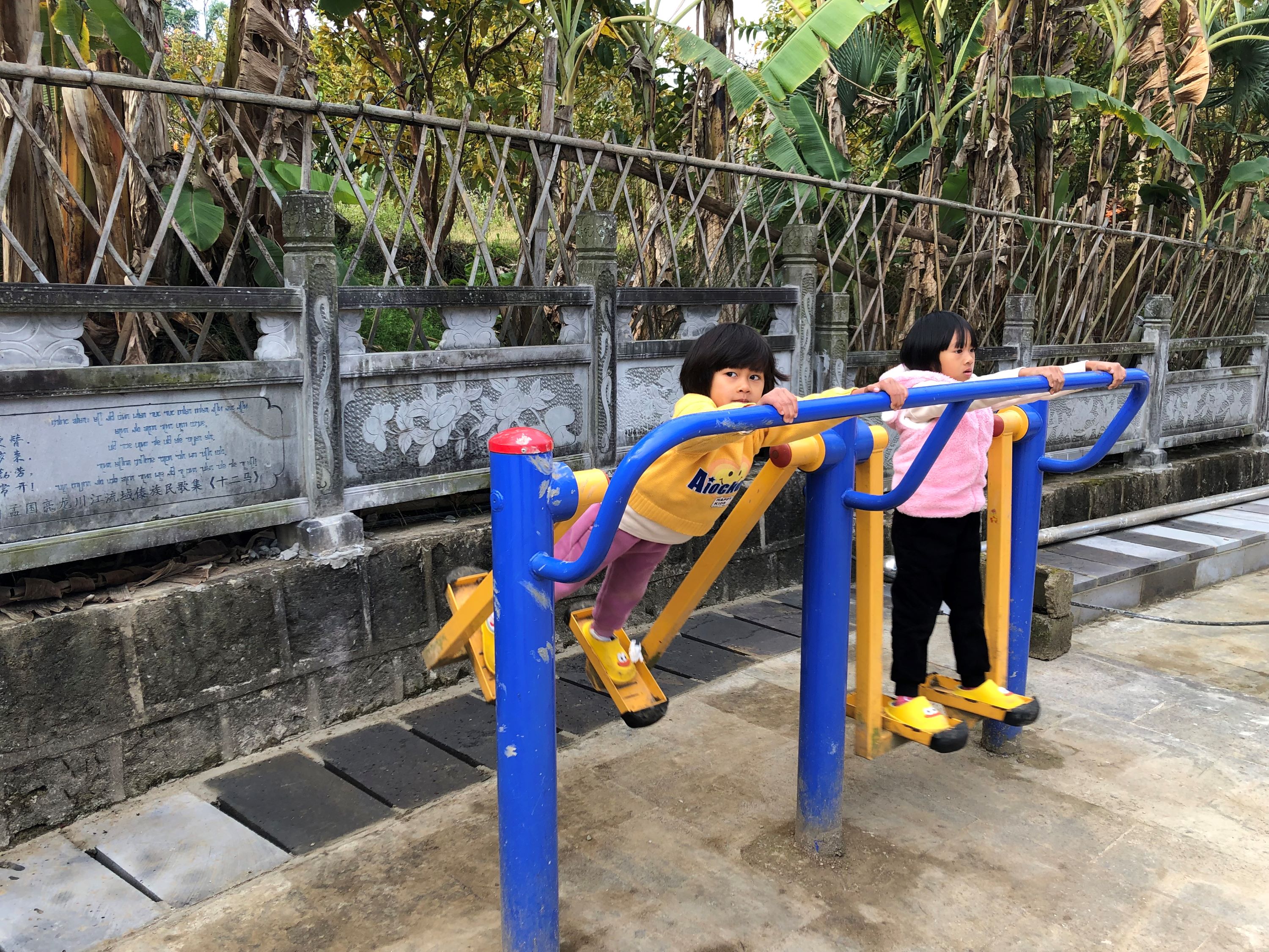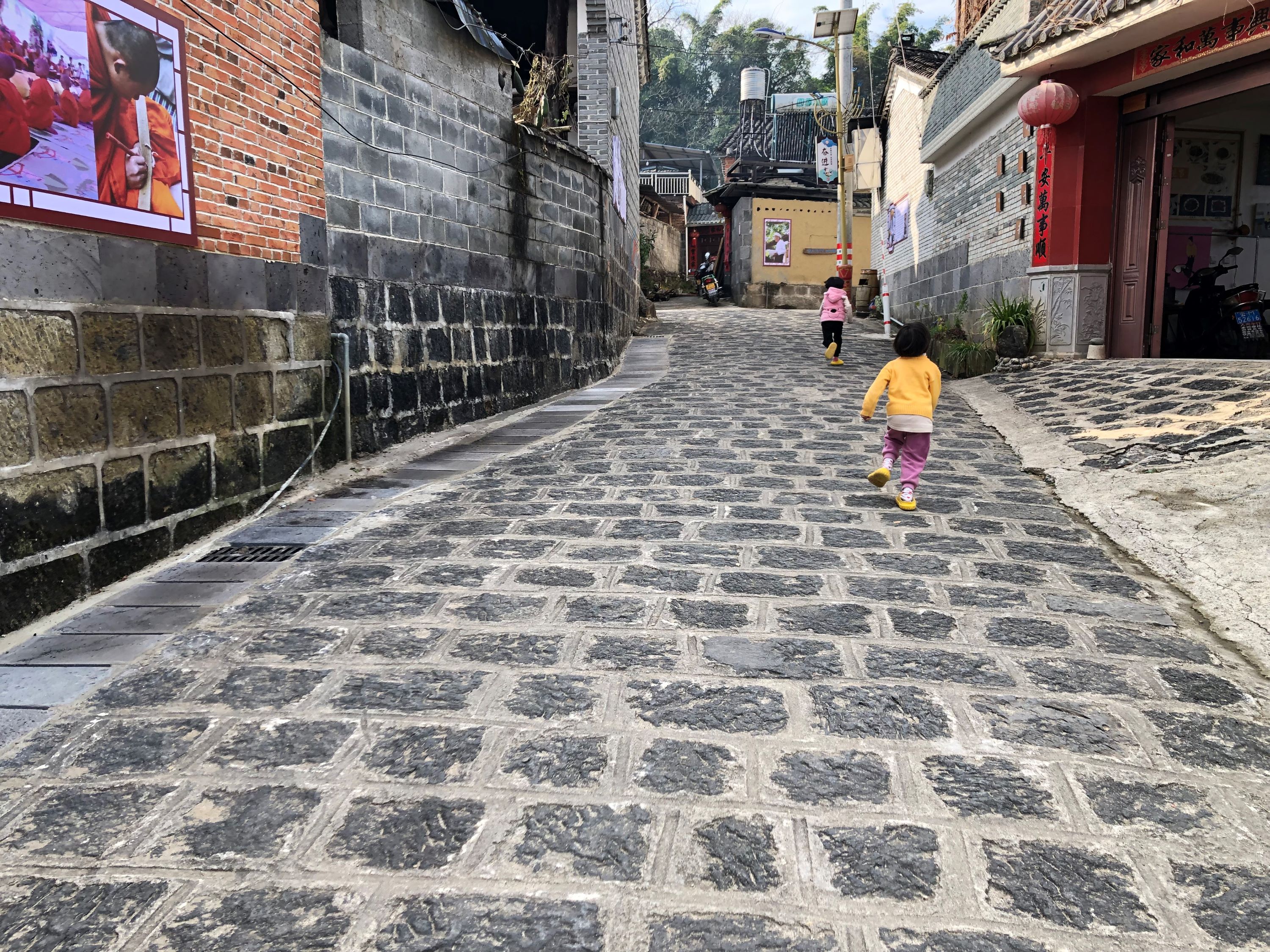 | Li and her sister are running freely and happily in the village, no worry to be tripped by the scattered pipes.