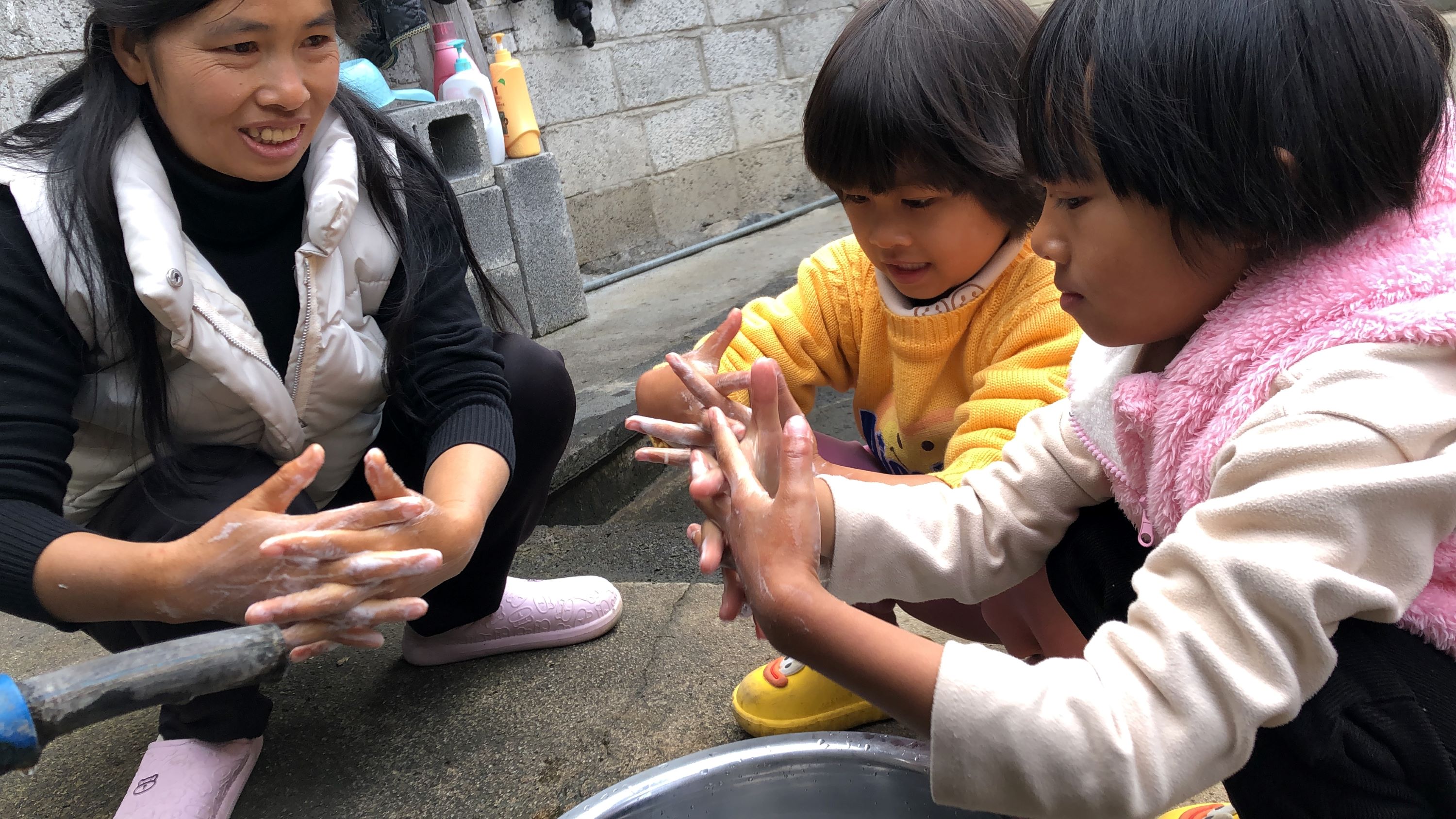 | Li's mum is leading her daughters wash hands with seven-step cleansing method.