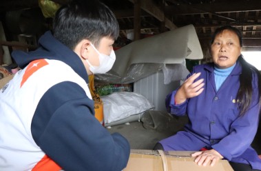 ▲Hu (right) shares the family kit she got with World Vision staff. Hu, aged 64, walked to the store room, showing us her two remaining bags of rice. Then she carefully climbed up the wooden ...