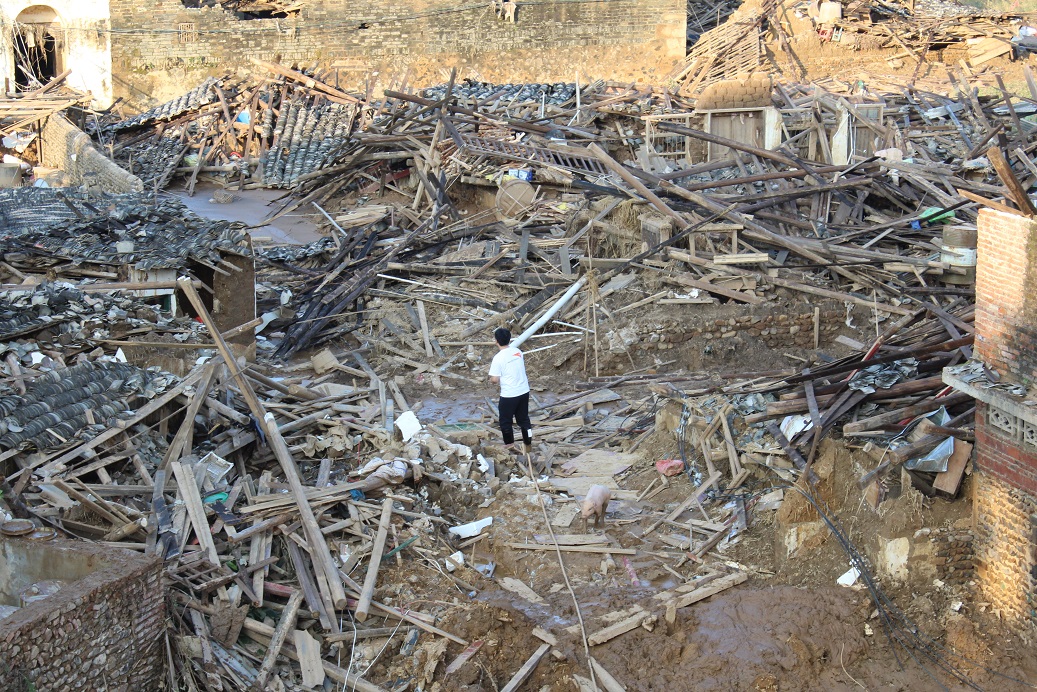 ▲江西省龙南县杨村镇沿江的居民住所受损严重,几乎所有的瓦房和土胚房完全坍塌。