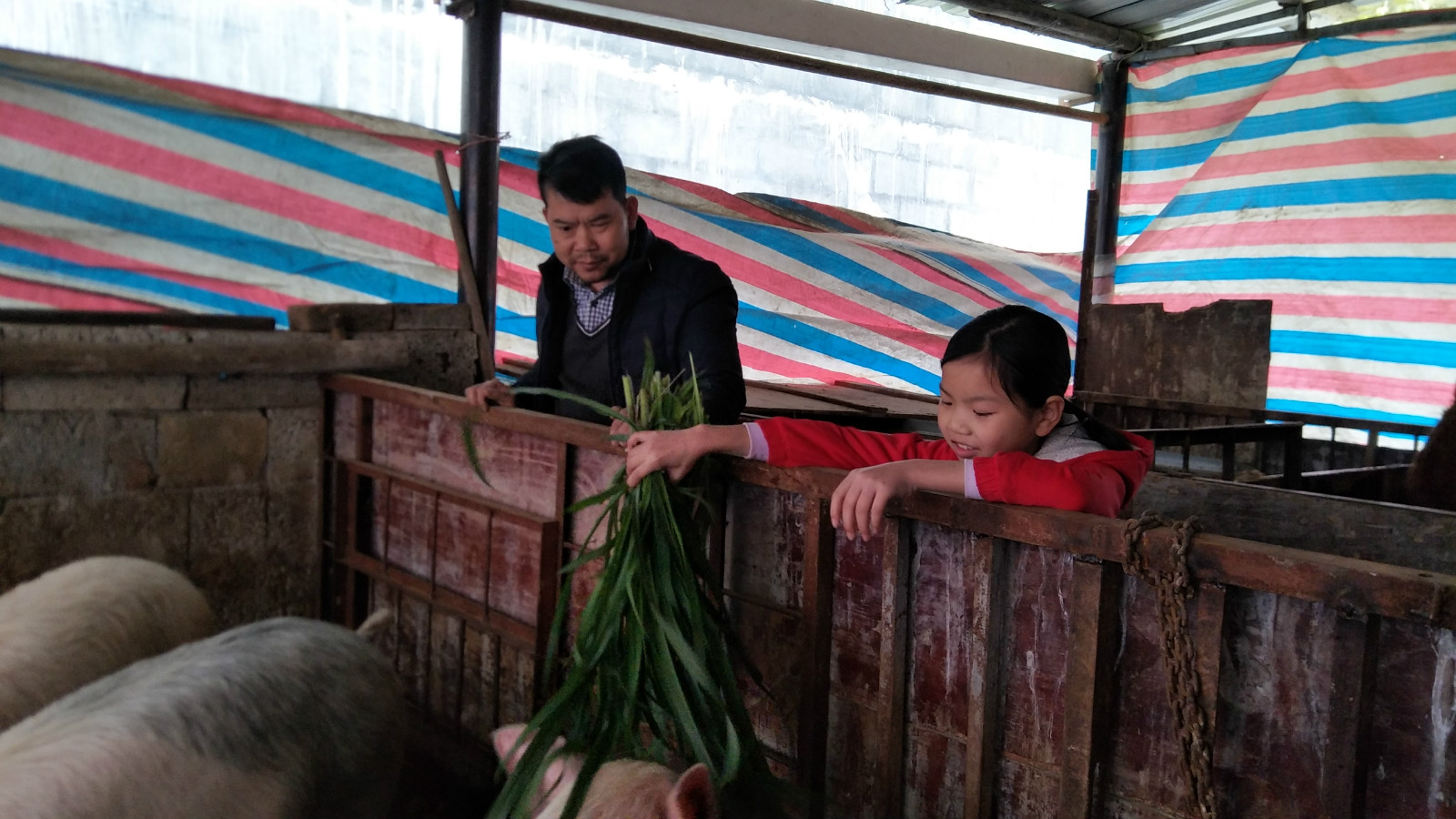 文娜放假在家的时候,很喜欢跟着爸爸一起割草喂猪。