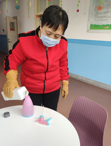 ▲为保证孩子们的健康,工作人员用消毒剂进行日常消毒
