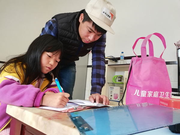 ▲福贵在给孩子讲解儿童家庭卫生包内物资的使用事项。