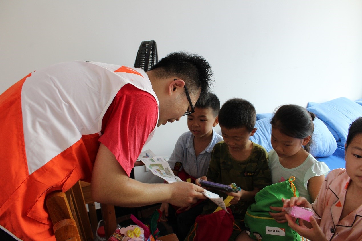 ▲世界宣明会工作人员在临时安置点给儿童发放儿童包,并向他们讲解防灾减灾的知识。