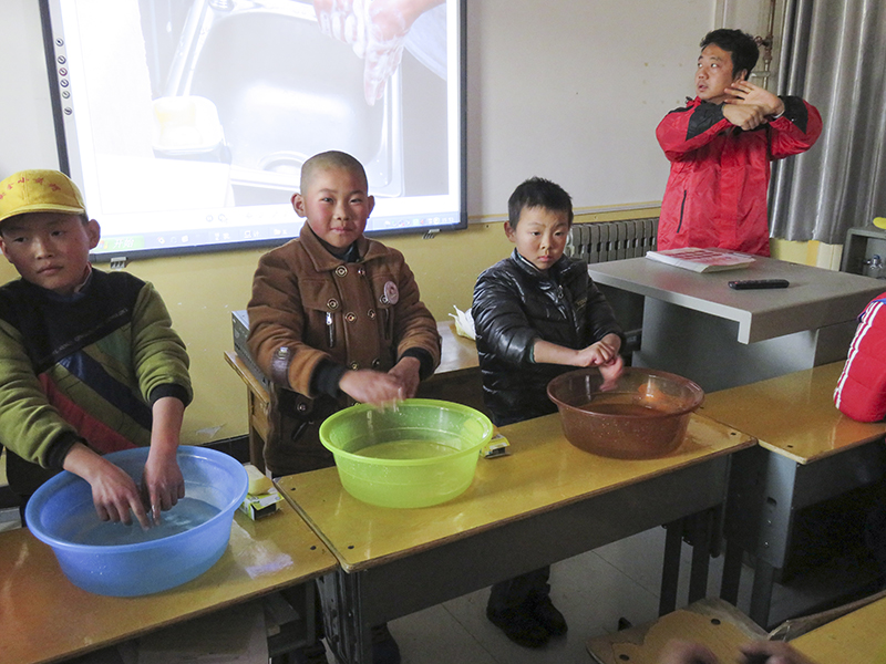 | 高伟东(右一)在教孩子们正确的洗手方法(2016年)