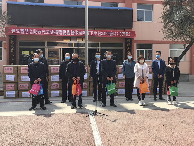 2020年新冠疫情发生后,世界宣明会与陇县教体局、陇县卫生健康局、陇县民政局、陇县慈善会、陇县红十字会等单位合作,先后向当地儿童和社区捐赠总价值58万余元的口罩、消毒液、卫生包等防疫物资。其中,捐赠卫生包3500个 ,包内含有免洗洗手液、电子体温计、香皂、毛巾、防疫知识手册等。高伟东和同事们忙前忙后,促成捐赠工作的顺利进行。