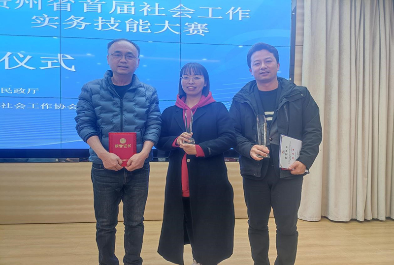 | 杨红平(左一)参加贵州省首届社会工作实务技能大赛。(2021年)。