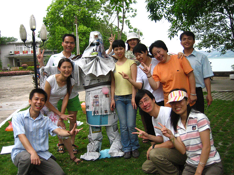 | 2007年5月,丘先生(前排右二)和同事们一起参加办公室团队活动。