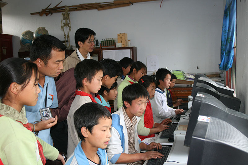 | 2007年6月,丘先生(右一)前往贵州剑河项目点,了解儿童对世界宣明会捐赠的电脑的使用情况。
