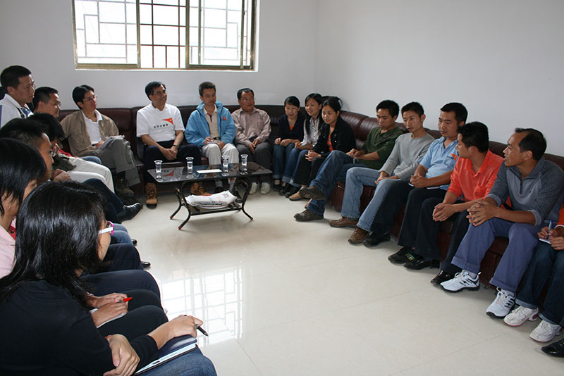 | 2007年6月,丘先生(左七)与当时的世界宣明会-中国总干事一起看望贵州项目点的同事,并聆听同事的心声。