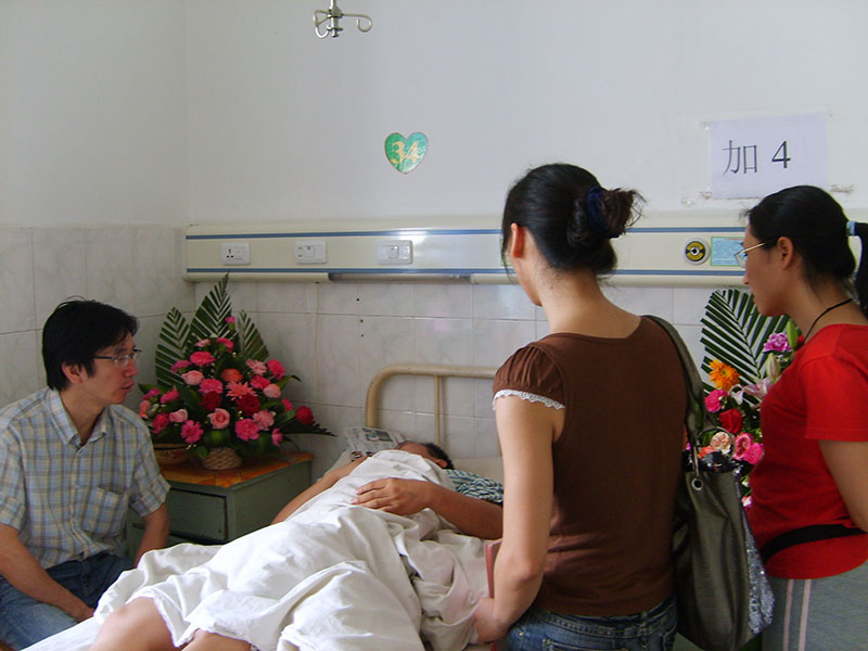 | 2008年5月,丘先生(左一)前往都安探望因车祸住院的同事。