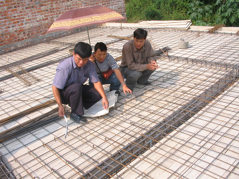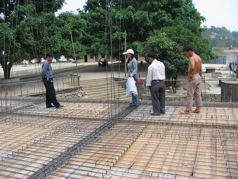| 农工参与田东县一所小学宿舍楼楼板钢筋验收。(农工右三,2006年8月)
