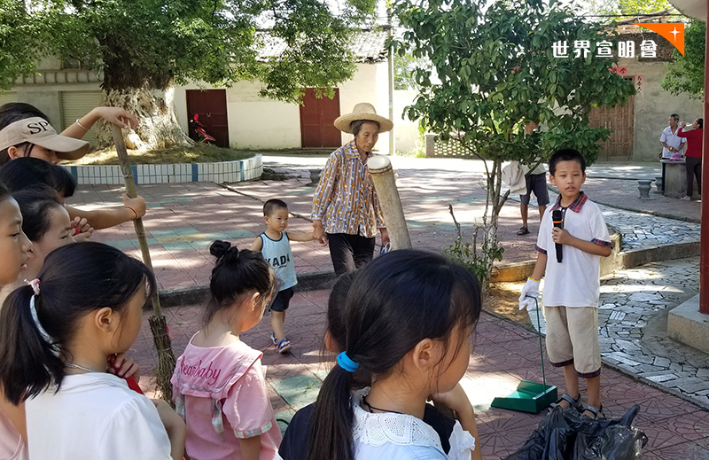 (作为儿童中心小组成员,小杰(右一)组织小伙伴们一起打扫村子,维持村子的清洁卫生,为社区提供服务。)