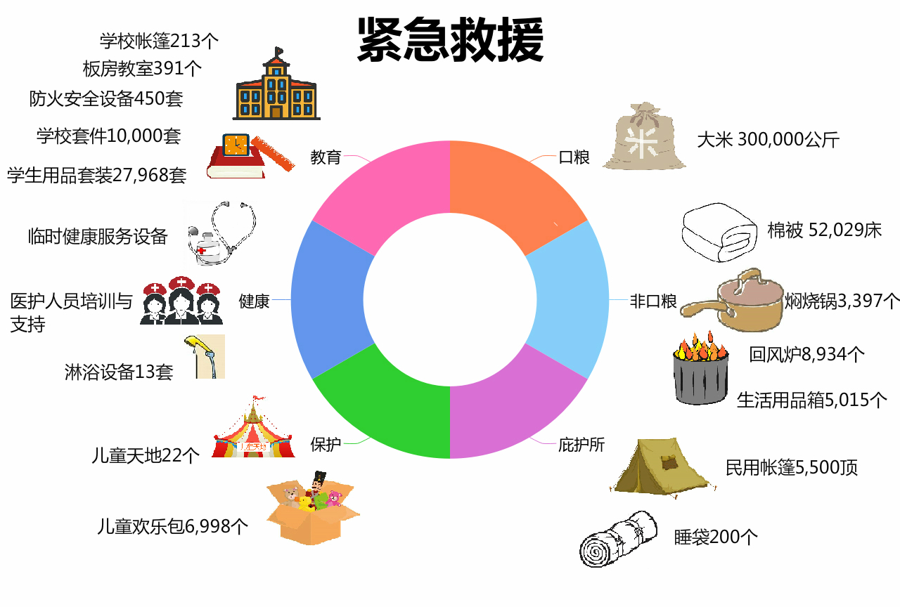 地震刚发生后,最重要的工作是紧急救援,宣明会及时就住屋、医疗卫生、基本生活需要作出回应,包括提供临时的住宿帐篷、彩条布、卫生所帐篷、食物、灶具、淋浴设备、健康知识宣传等,保障灾民的基本生活;同时关注儿童工作和教育,搭建板房教室和儿童天地,又向儿童派发欢乐包和开学包,关顾灾后儿童的心理需要。