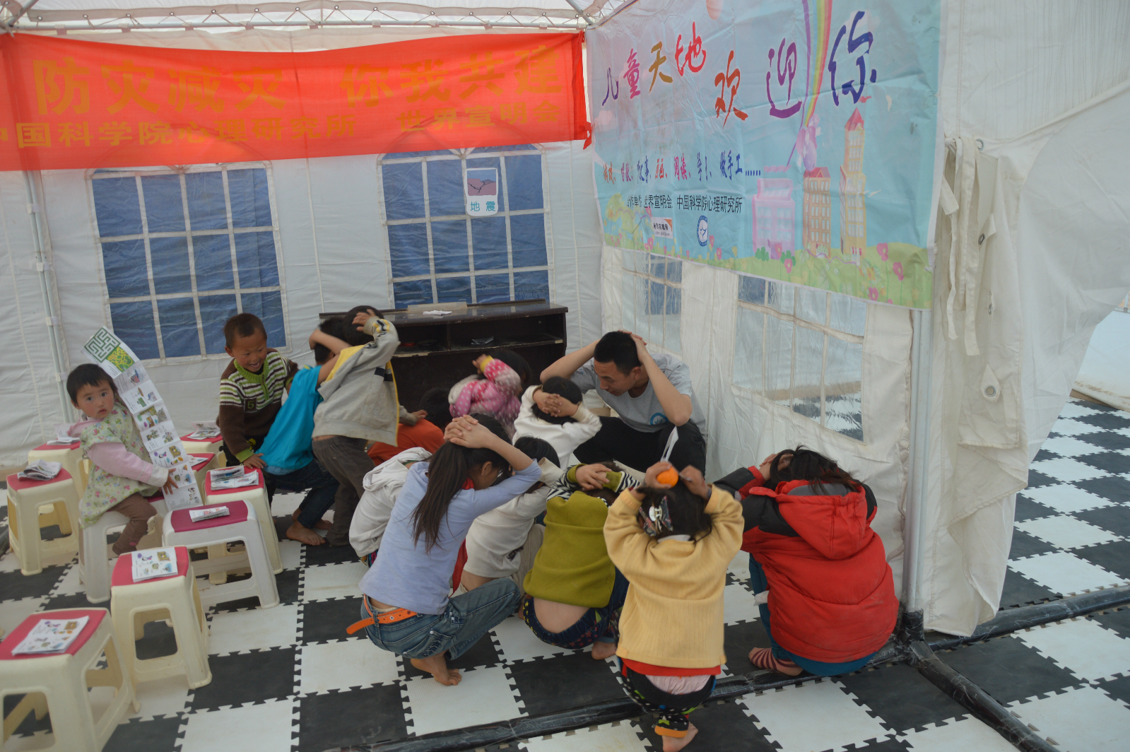 在志愿者的带领下,孩子们模拟地震发生时如何进行自救互救。